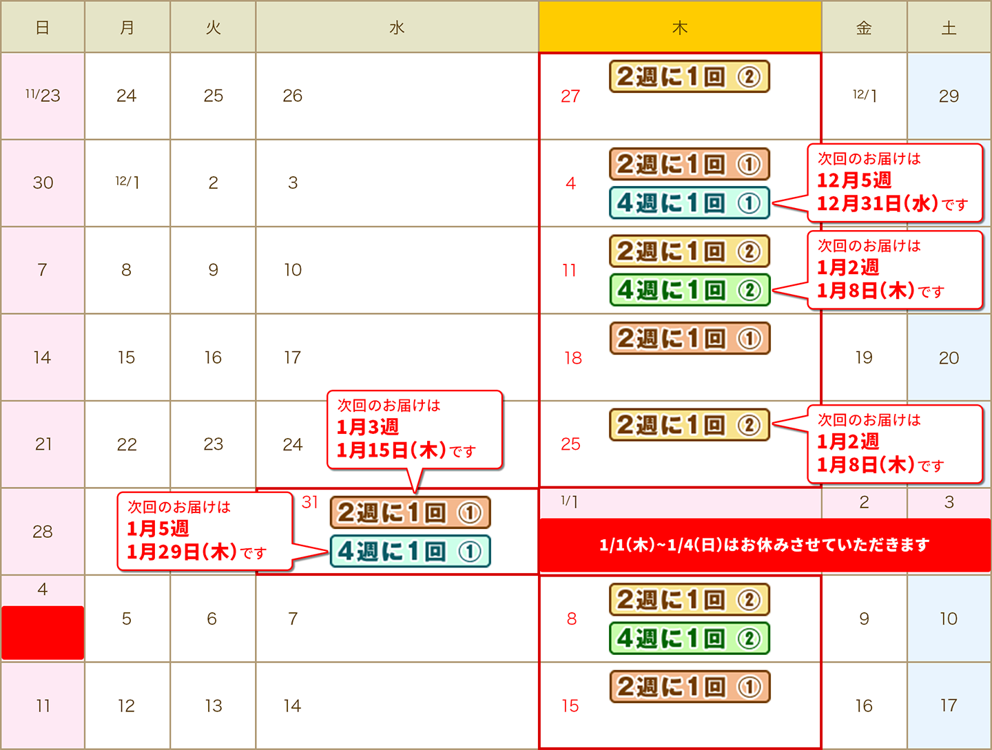 年末年始配達スケジュール★年内最終の商品お届けは、12/31(水)となります。※いつもの配達曜日と異なります。