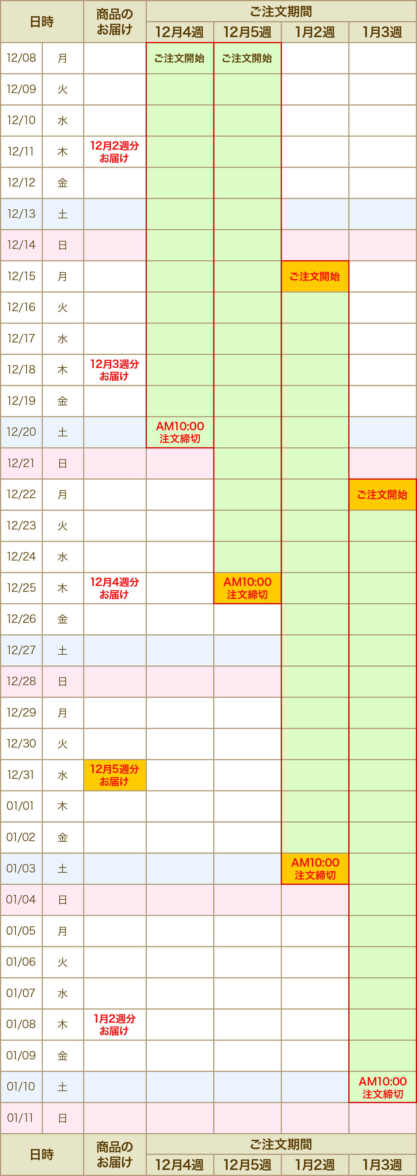 ★12月5週のご注文締切日は、12月25日(木)AM10時となります。